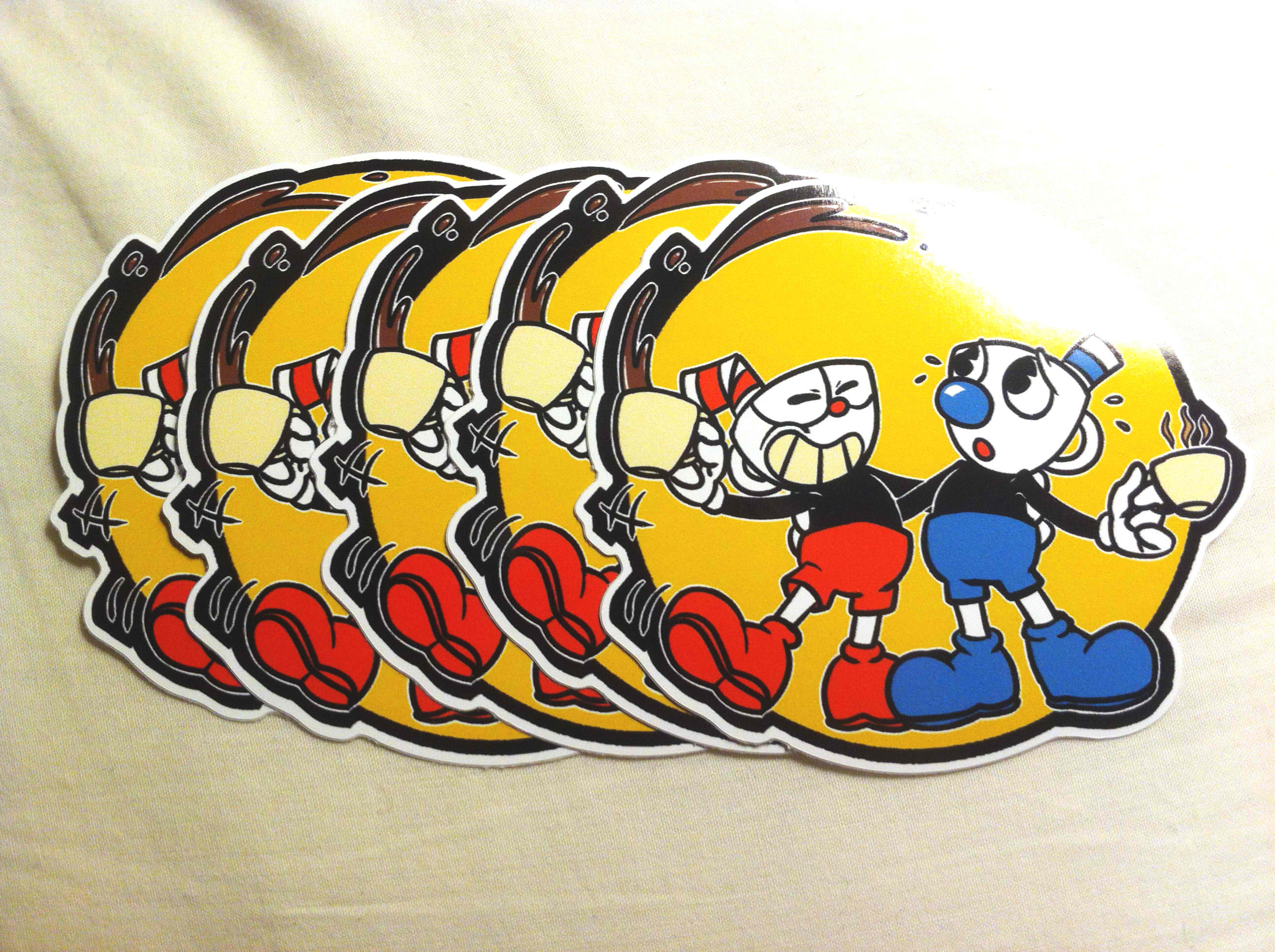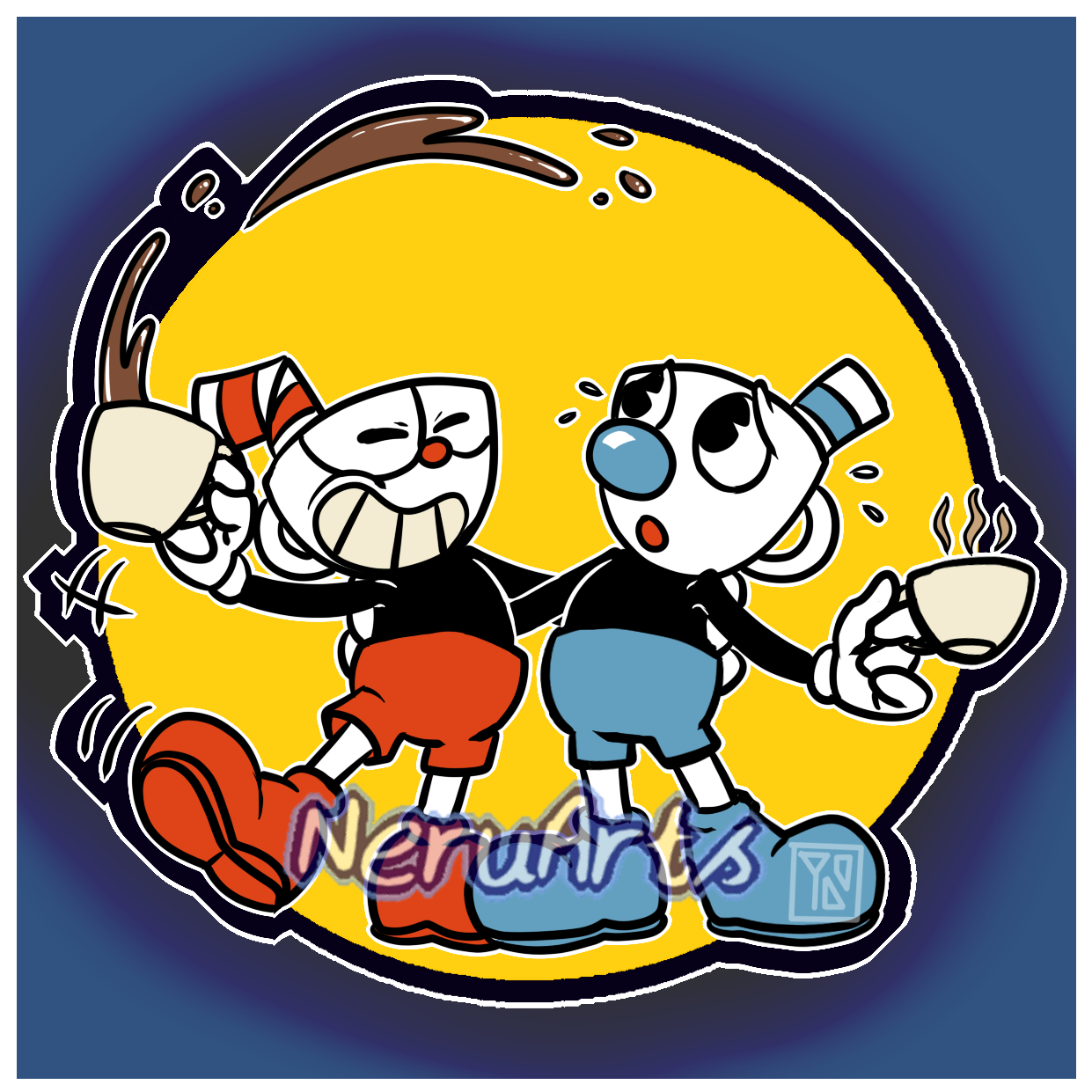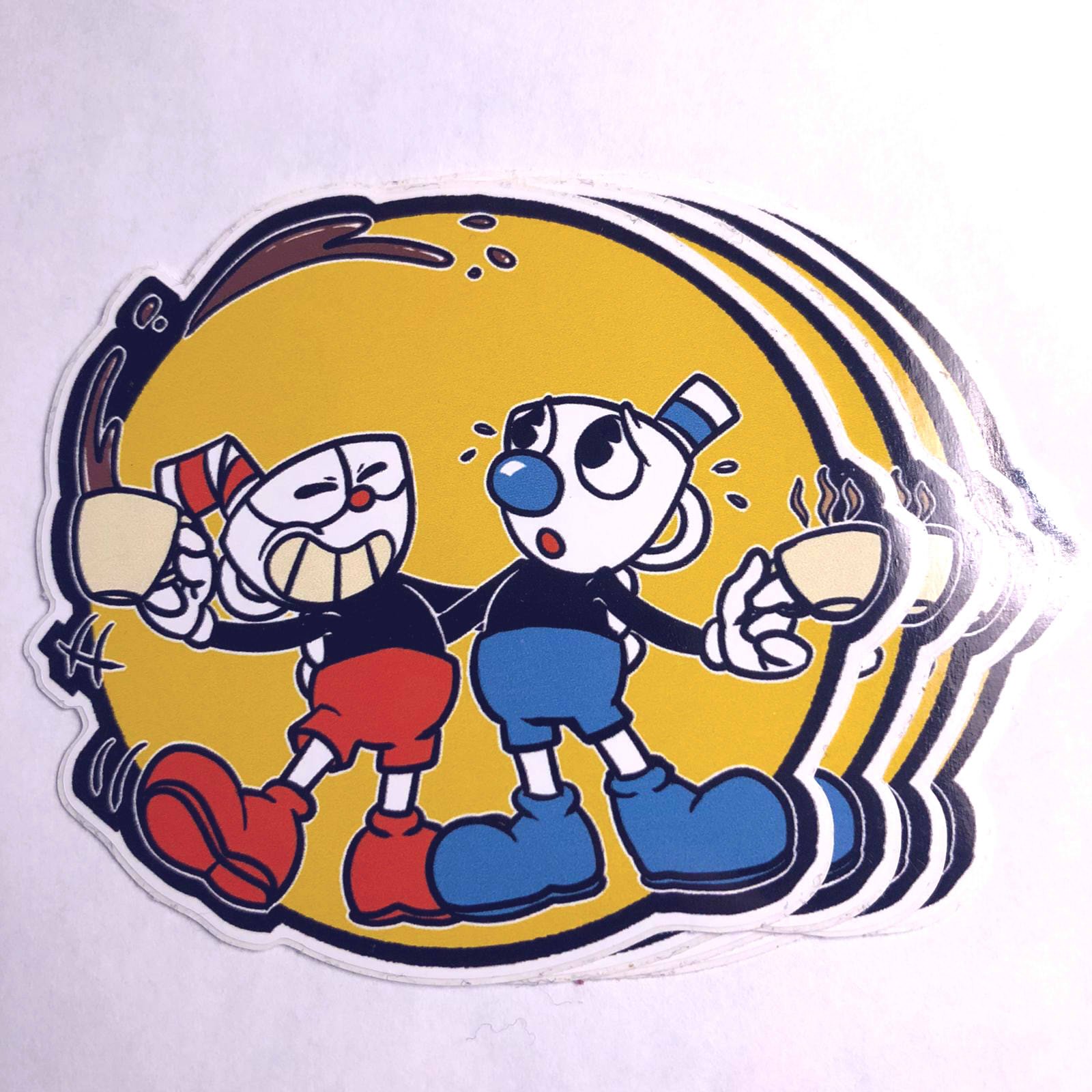 An 8x8cm sticker of Cuphead and Mugman seconds before disaster!!