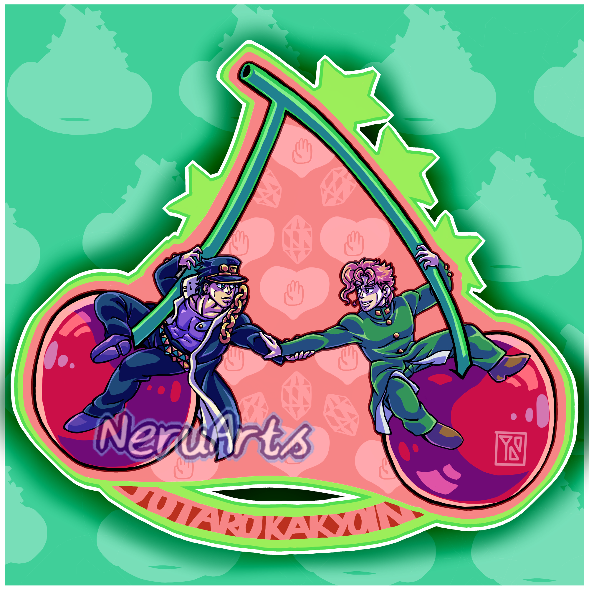 A silly 8x8cm sticker of Jotaro and Kakyoin on a giant cherry